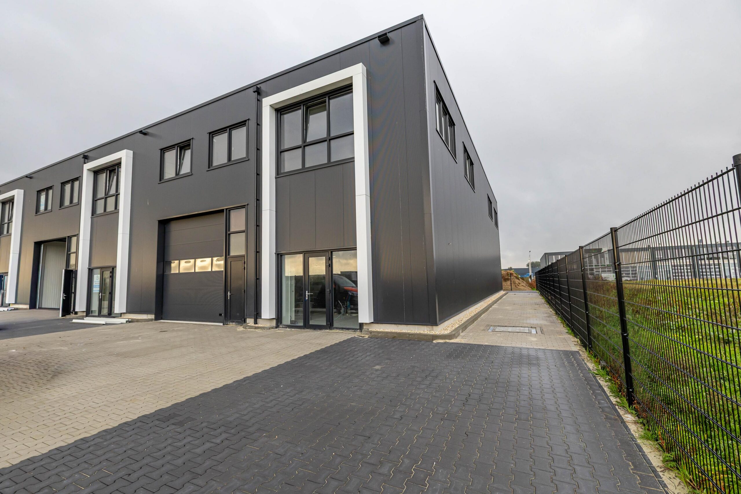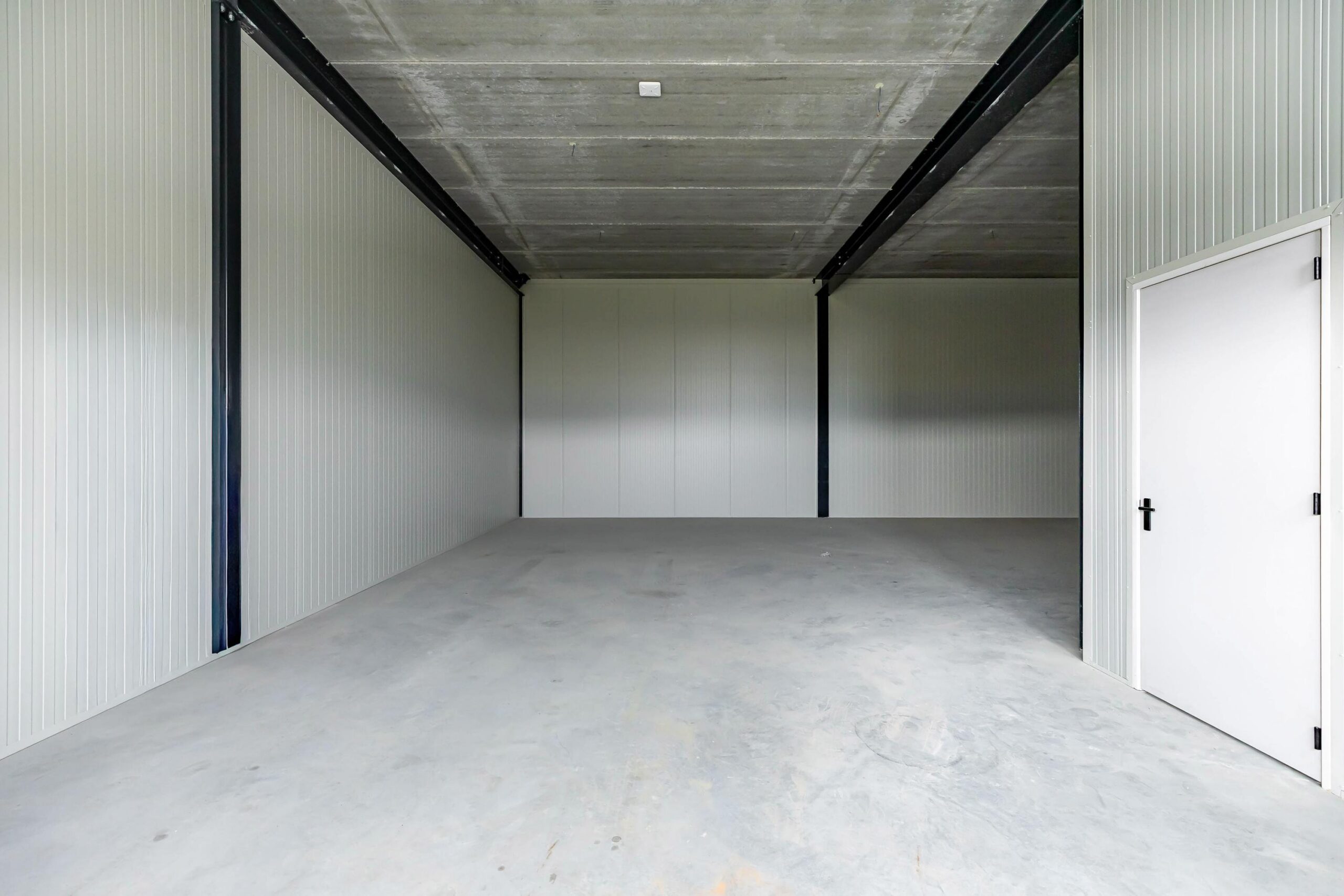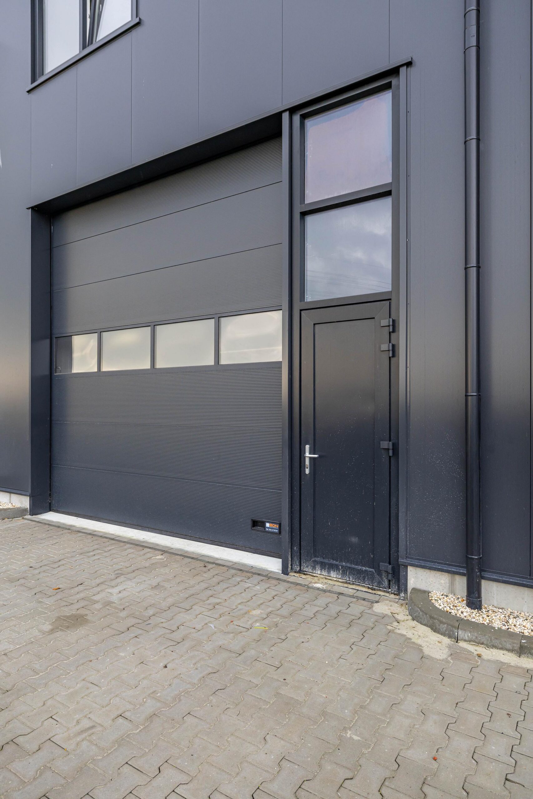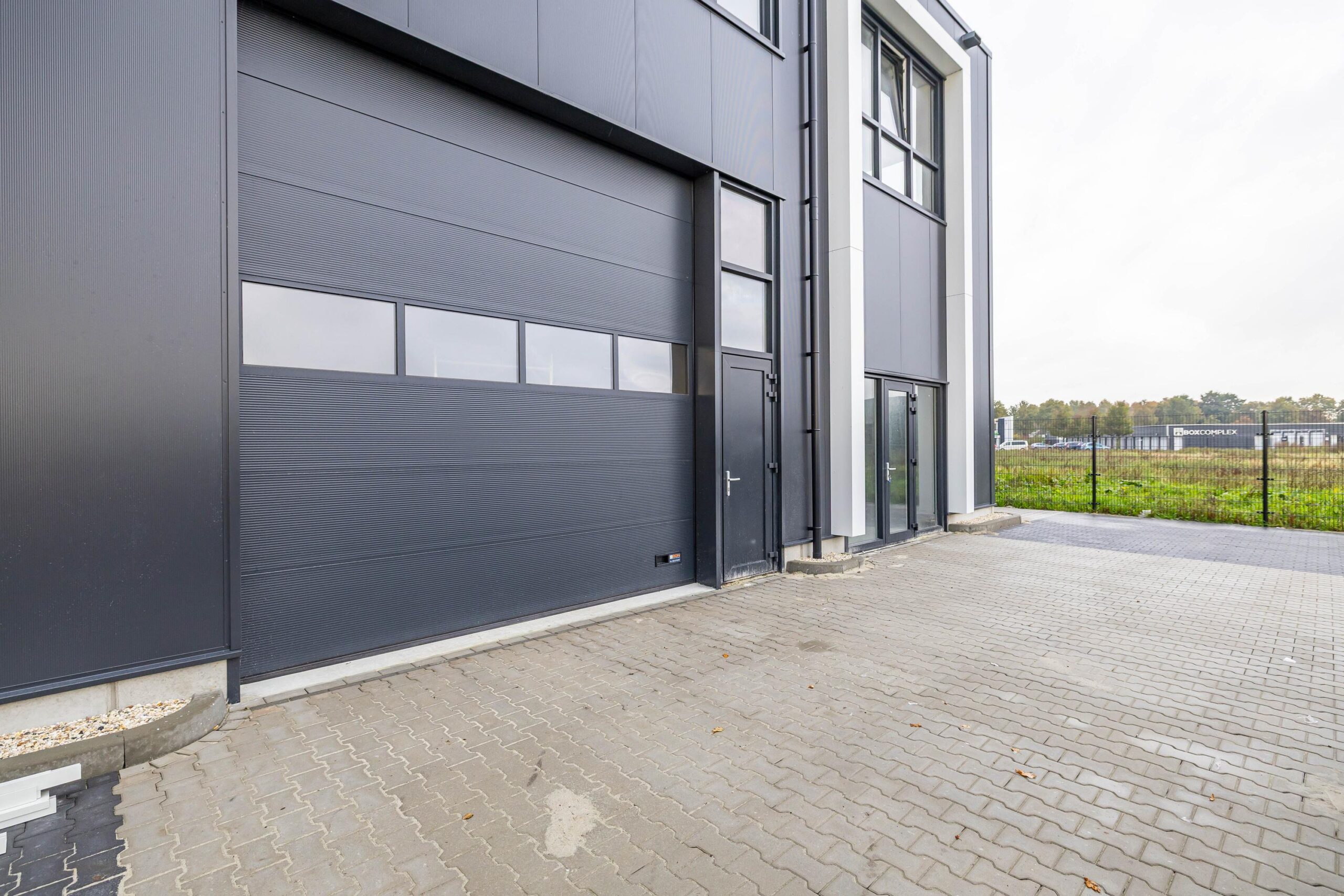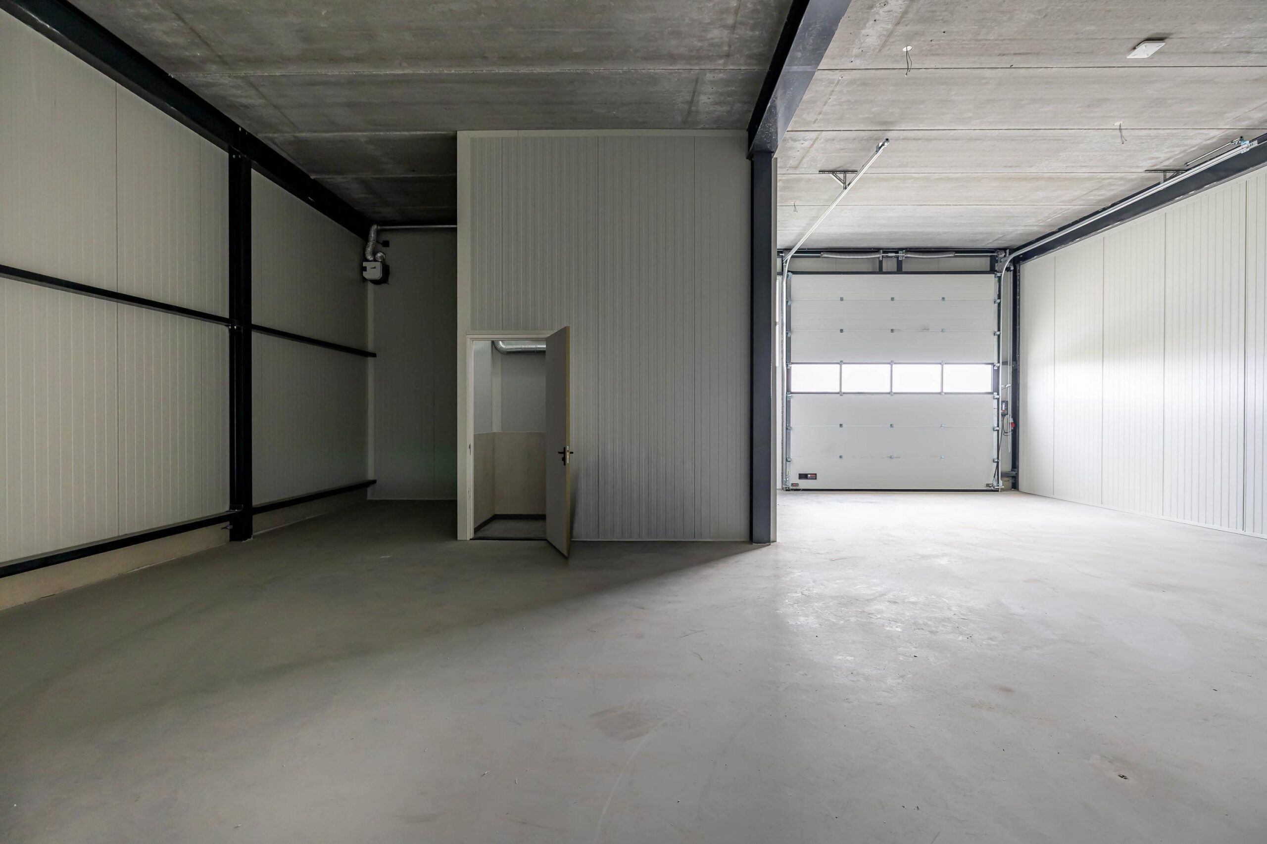 – Een grote elektrisch bedienbare overheaddeur (400 cm breed x 420 cm hoog) met separate loopdeur.